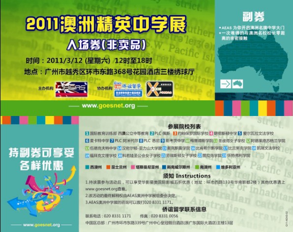 持本入场券的同学们可于3月12日前往花园酒店免费参加本届广州AEAS澳洲精英中学展,与来自23间排名一百名以内的澳洲精英中学的校长和代表们面对面接触交流,认识来自国际的顶尖中学教育,开阔视野,给人生的学业之旅另一个与众不同的选择机会。除此之外,同学们可凭副券购买华南影都电影票享受五折优惠。