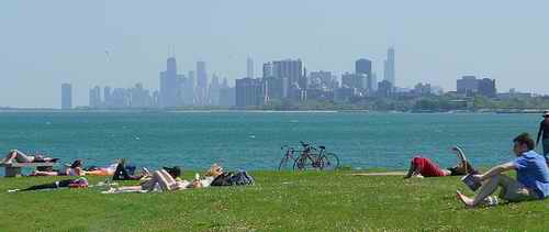 湖岸上面是大片大片的草地,很绿很密很厚很柔软,踏上去如地毯,埋住了双脚。不少人来这里晒太阳,也有躺在草地上读书的。