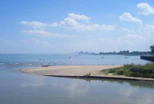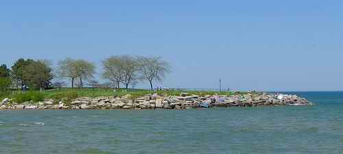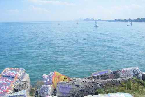 从另一个角度看这个公园,周围被密歇根湖包围,沿着湖岸堆满形态各异的巨石。