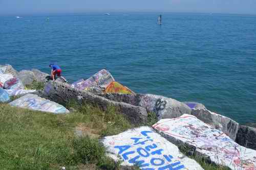 湖岸线其实很长,公园也是长形的,蜿蜒在湖岸的巨石都被涂满了各种字画,写满了爱的誓言。