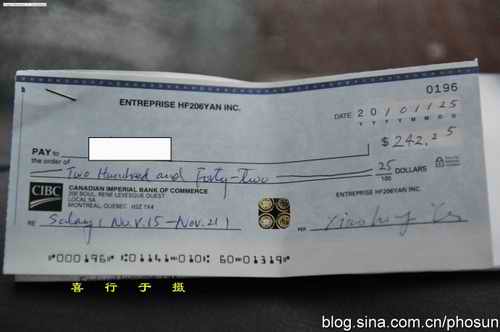 每个加拿大的打工仔每隔两周就会收到这样的支票。加拿大的银行业比较发达,完全可以通过转账实现工资发放,但是现实生活中,大部分人偏爱支票。特别是涉及到和个人有关的“钱”的问题,大多采用支票划转。发薪水用支票,纳税交支票,买房子交支票,付房租交支票,政府退税发支票,学生上学交支票,政府发放学生贷款发支票,等等。一般的人都喜欢钞票或是支票,这就是感官享受吧,其实和网上支付是异曲同工的。注意:支票的计算期是从15号到21号的,也就是7天为一个工资的计算周期。届时老板会给工人两张这样的支票。特殊的情况,在餐饮业或节假日等也有一周发放一次工资的。但最迟不能超过应发工资日的第8天,否则就是违法。