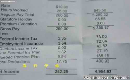 在加拿大工作的工人每两周就可以领到一次工资,不管你是白领,还是蓝领或是农民工,偷渡难民还是学生黑工。只要你干了活,老板就得掏钞票,每两周一次,一张支票外加一张清单(工资条),乖乖的送到你的手上。