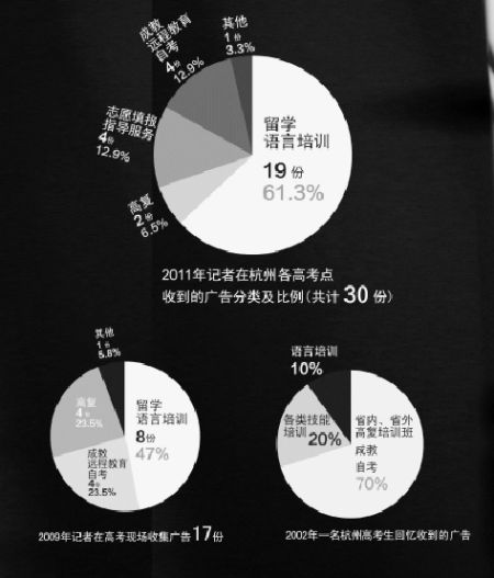 2002、2009和2011年记者在杭州各考点收到的广告分类及比例(制图 黄昕)