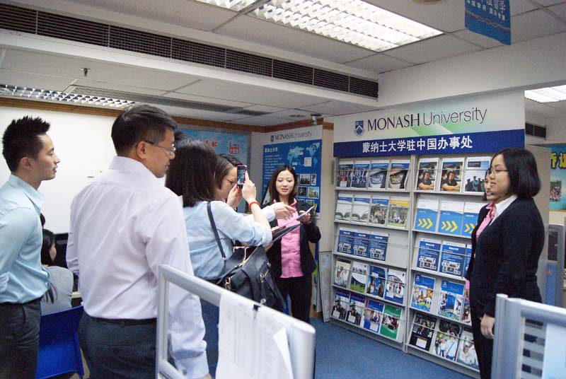 2011年11月02日,来自澳洲Monash University的常务董事Sunny Yang,地区经理Karen Zhang,学生办副主任John Tang来访侨谊留学-香港学联集团中国区总部,参观侨谊留学办公室。对留学顾问们进行院校培训,并进行院校面试。