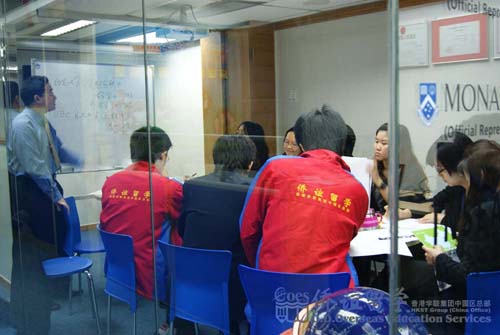 侨谊留学资深美加留学顾问专心致志地听取加中国际总裁Frank Wang先生讲解加拿大十大名校硕士项目