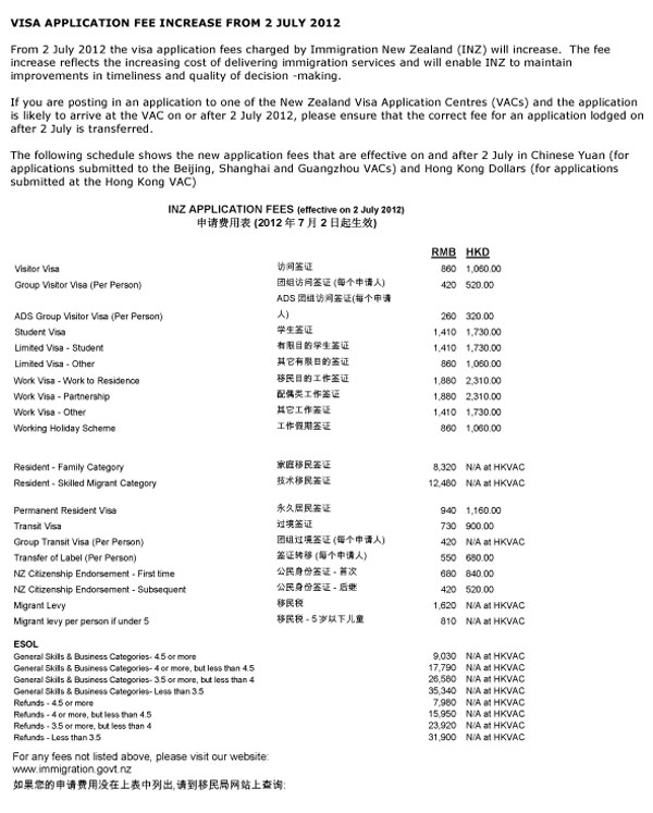 新西兰移民局15日宣布,将于7月2日起增加签证申请费用,各类签证申请费用的平均增幅为16.7%。
