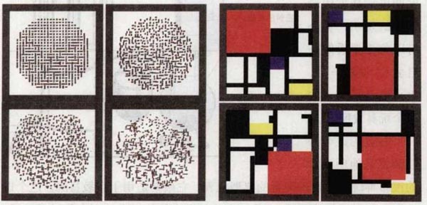 问题:下面分别有黑白和彩色2组图案,每组有4幅图,每幅中有1幅是蒙德里安(荷兰著名风格派画家)的原画,其他3幅都是用电脑制作的仿制品。请你分别找出这两组图案中的蒙德里安的原画。