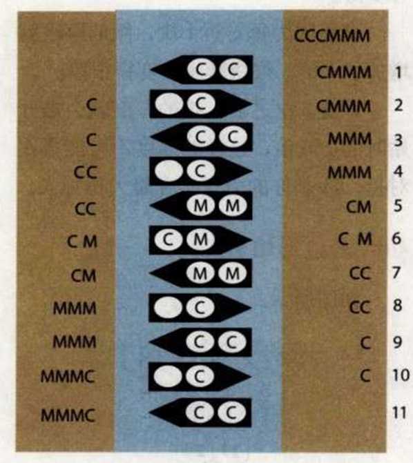 答案:一共有4种不同的解法,最少都需要4次才能将它们全都带过河。如图所示是其中的一种解法,其中M代表老鼠,C代表猫。