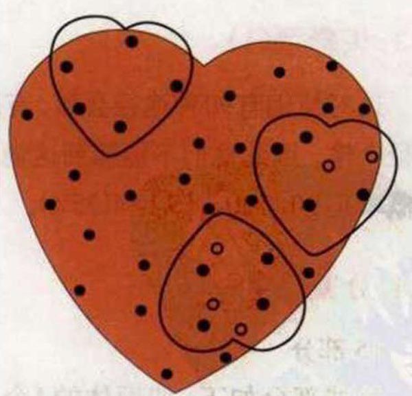 问题:如图所示,大的心形图案上有很多钉子(在图中用黑色的圆点表示),3个小的心形图案上各有一些小孔(在图中用白色的圆点表示)。现在请你将这3个小的心形图案覆盖到中间的大的心形图案上,尽量让这些小孔能够覆盖最多的钉子。提示:可以将3个小的心形图案旋转之后再覆盖上去。
