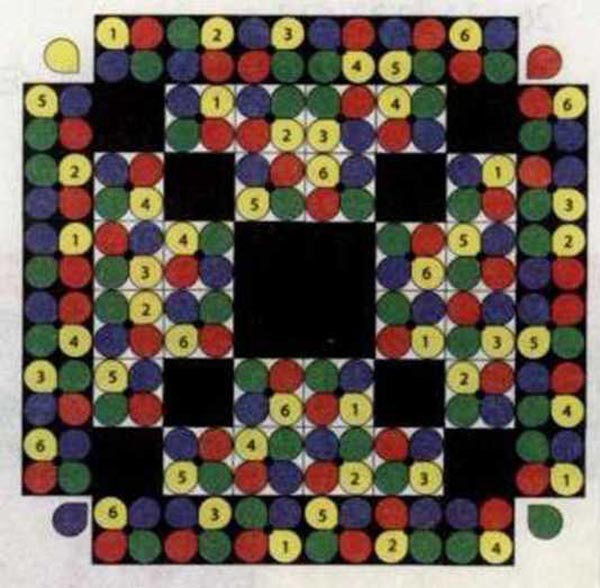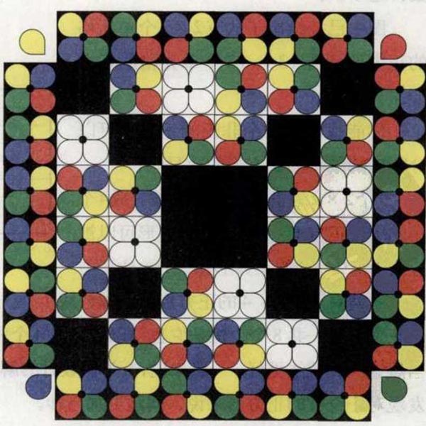 答案:这个图案与风车的4种颜色密切相关。4种颜色一共可以有24种不同的组合,而在我们的题目中,不计纸风车的旋转,这样就还剩下6种不同的颜色组合。每一横行或每一竖行都正好包含这6种不同的颜色组合,从黄色开始: