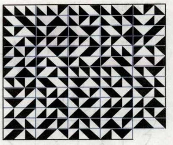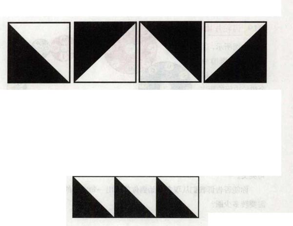 问题:已知图形是一个被对角线分成2个三角形的正方形,这2个三角形分别为黑色和白色,而且这个正方形可以通过旋转得到4种不同的图案,如下图所示。