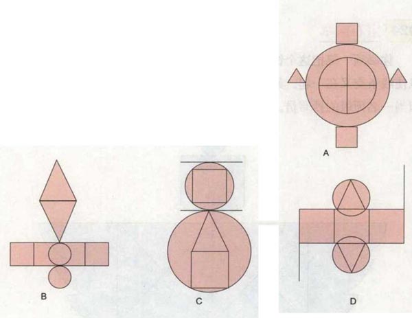 A, B和D都包含两个圆、两个正方形、两条直线和两个三角形。在C图中只有一个三角形。