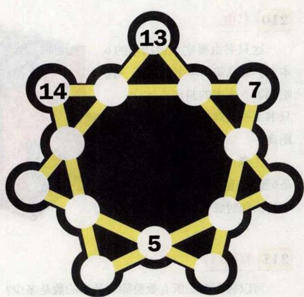 问题:你能将数字1到14填入右边的七角星圆圈内,使得每条直线上数字之和为30吗?