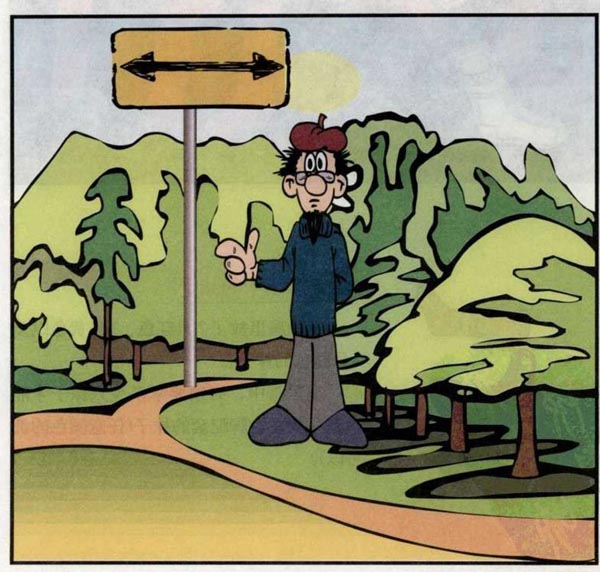 问题:真理城的人总是说真话,而谎言城的人总是说假话。你在去往真理城的路上看到了上面的这个路标,但是这个路标让人摸不着头脑,因此你必须要向站在路标旁边的人问路。不幸的是,你并不知道这个人究竟是来自真理城还是谎言城,而你只能问这个人一个问题。你应该问一个什么问题,才能找到通往真理城的路呢?