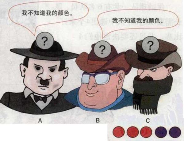 答案:如果B和C的贴纸都是蓝色的,那么A就会知道自己头上的是红色的,但是A并不知道自己的颜色,因此B和C中至少有一个或者两个人都是红色的。如果C是蓝色的,B应该知道自己是红色的,但是B不知道,因此C的贴纸一定是红色的。
