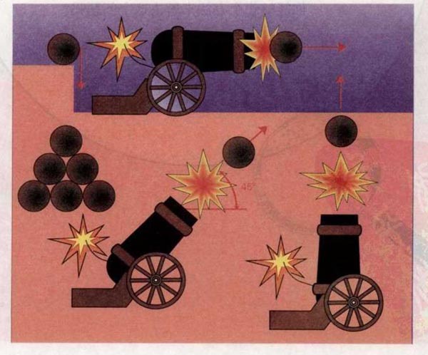 问题:如果这3门大炮在同一时间开火。最上方的大炮沿着地平线在同一高度平行发射,左下方的大炮与地平线成45°角发射,右下方的大炮垂直与水平线成90°角发射。哪一个炮弹最先接触到地面?剩下的将以什么顺序降落?