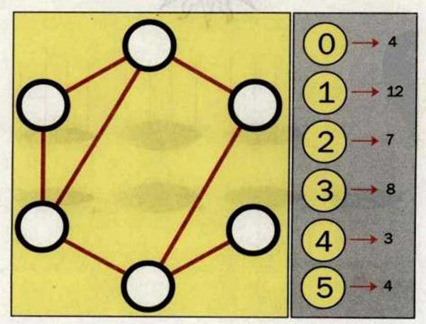 问题:你能够否将0〜5这6个自然数填入圆圈中,使得每个数的所有相邻数之和如箭头所指(相邻指的是有红色实线直接相连)。