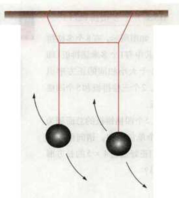 问题:两个摆可以有很多种不同的组合方式,最简单的方法就是把它们用绳子挂起来,如图所示。你可以用一支铅笔和两颗珠子来制作这个装置。分别用绳子将两个“摆锤”系在起连接作用的绳子上,这样它们摆动的时候就正好与这根绳子垂直。如果你用手拉动其中一颗珠子让其运动起来,那么这个装置会发生什么变化?