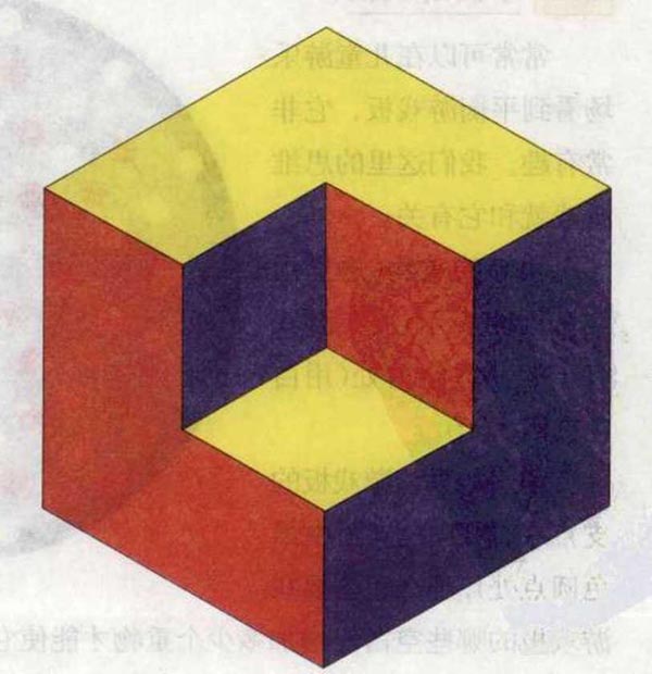 答案:这是一个经典的变换视觉主体图形的问题。有些二维的图形在解读它的三维效果时有多种方法。这个顶点处的正方形可以有3种方法来解读它,但是其中每一种印象都不会持续很久。
