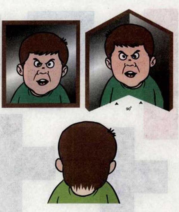 问题:如右图所示,一个男孩分别从1面平面镜和2面以90° 角相接的镜子中观察自己。男孩的脸在2种镜子中所成的像是一样的吗?