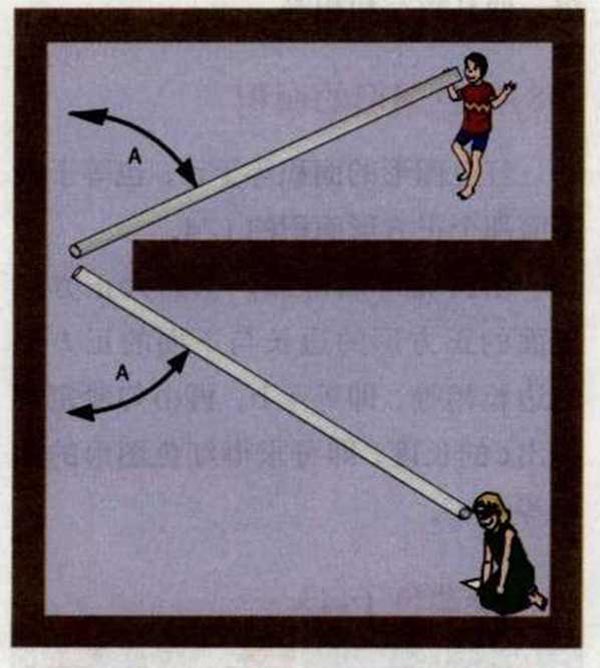 答案:声音的传播跟光一样,也遵循反射定律。如下图所示,当两根管子跟墙所成的角度分别相等时,两个孩子就能够听到对方讲话。声波反射到墙面上,然后再通过墙反射进管子。