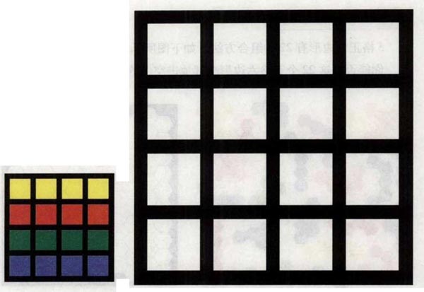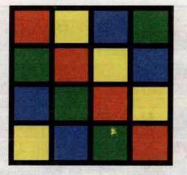 问题:你能将这些色块分配到网格中并使得每一种颜色在任何一行或列中仅仅出现一次吗?