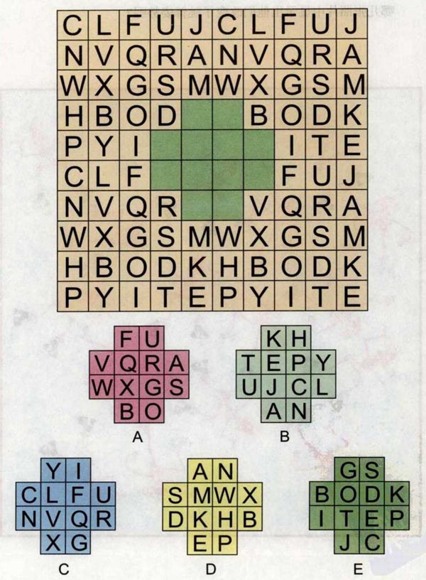 答案:B,把大正方形分成4个部分,每个部分的字母都按相同的形式排列。