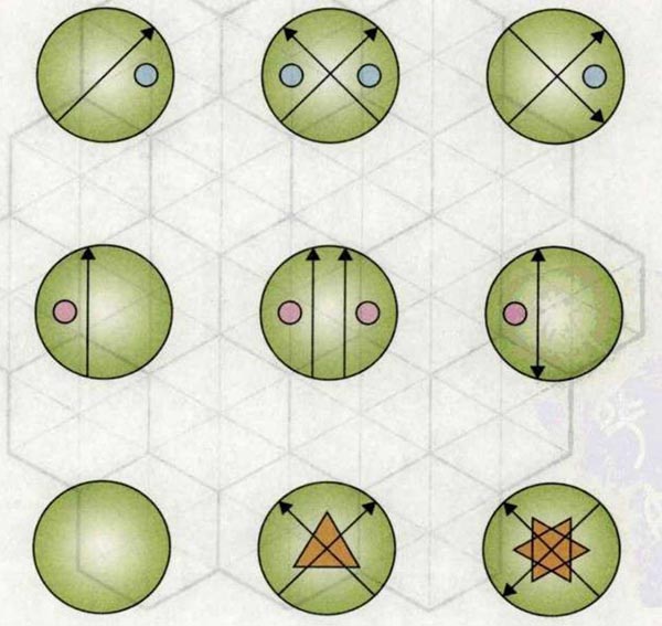 答案:从左向右进行,把左边的圆作为起始图形,这个图形与它围绕纵轴反射后的图形组合在一起,就是中间的图形;这个图形与它围绕横轴反射后的图形组合在一起,就得到下边的图形。