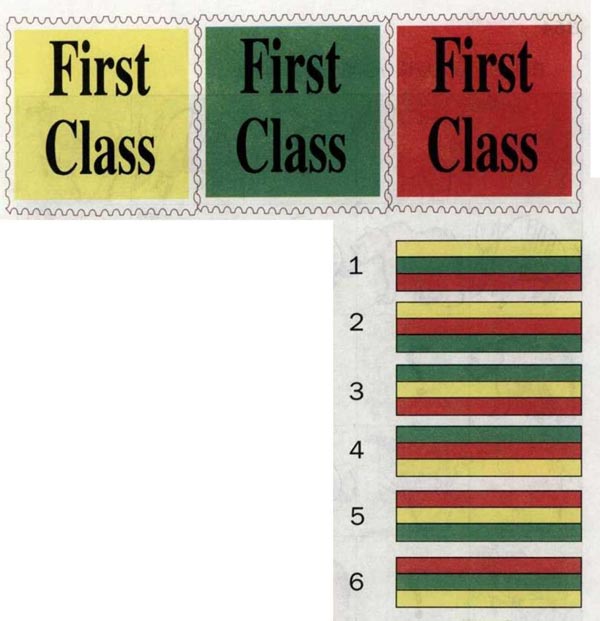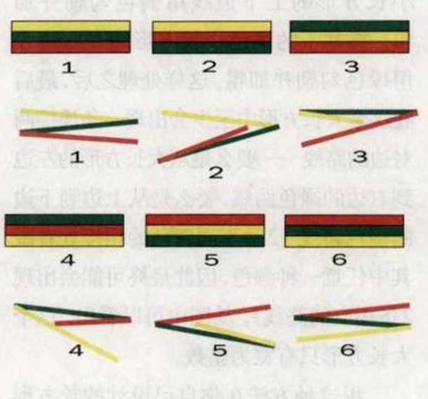 问题:这一套邮票共3张,你能说出一共有多少种折叠方法吗?只能沿着邮票的边缘(锯齿) 处折叠,最后必须折成3张上下放置。邮票朝上朝下都没有关系。3种颜色有6种排列方法。如图所示。可以折出其中的几种?