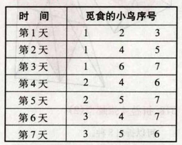 问题:7只小鸟住在同一个鸟巢中。它们的生活非常有规律,每一天都有3 只小鸟出去觅食。7天之后,任意2只小鸟都在同一天出去觅食过。将7只小鸟分别标上序号1〜7,请你将它们这7天的觅食安排详细地填在表格中。