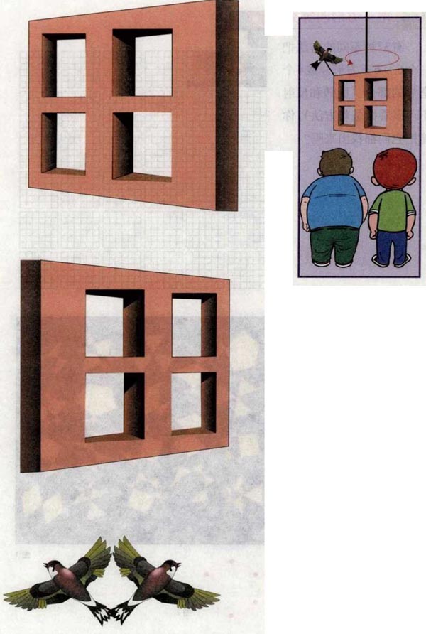 问题:将给出的窗户和鸟复制或剪下来,用胶水粘成上图的样子。在粘之前用一个夹子将小鸟夹在窗户上,如图所示。将粘好的窗户和小鸟挂在一根绳子上,让它慢慢旋转。然后站得远一点,闭上一只眼睛看这个结构。几秒钟后你会看到什么呢?你一定会大吃 一惊的。