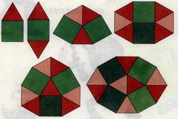 问题:下图的凸多边形(从五边形到十边形)都是由全等的三角形和正方形组成的,现在请问组成十一边形至少需要多少个这样的三角形和正方形?
