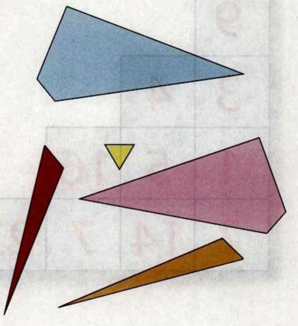 问题:将下边的图形复制到另外一张纸上,然后用剪刀仔细地将图形剪下。现在交给你的挑战就是将这些图形进行排列,使它们“制造出” 一个等边三角形。