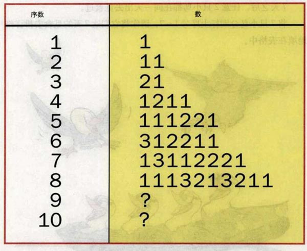 答案:第9个数是31131211131221。第1# 数是13211311123113112211。在这个数列里的每一个数都是描述前一个数各个数字的个数(3个1, 1个3,1个2等)这个数列里的数很快就变得非常 大,而且这个数列里的数字不会超过3。比如,这个数列里的第16个数包含102 个数字,而第27个数包含2012个数字。这个数列是由德国数学家马利欧• 西格麦尔于1980年发明的。