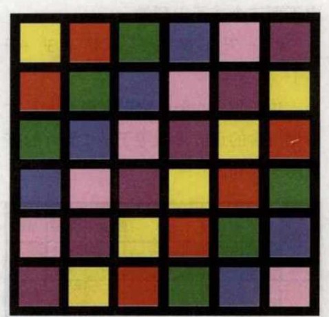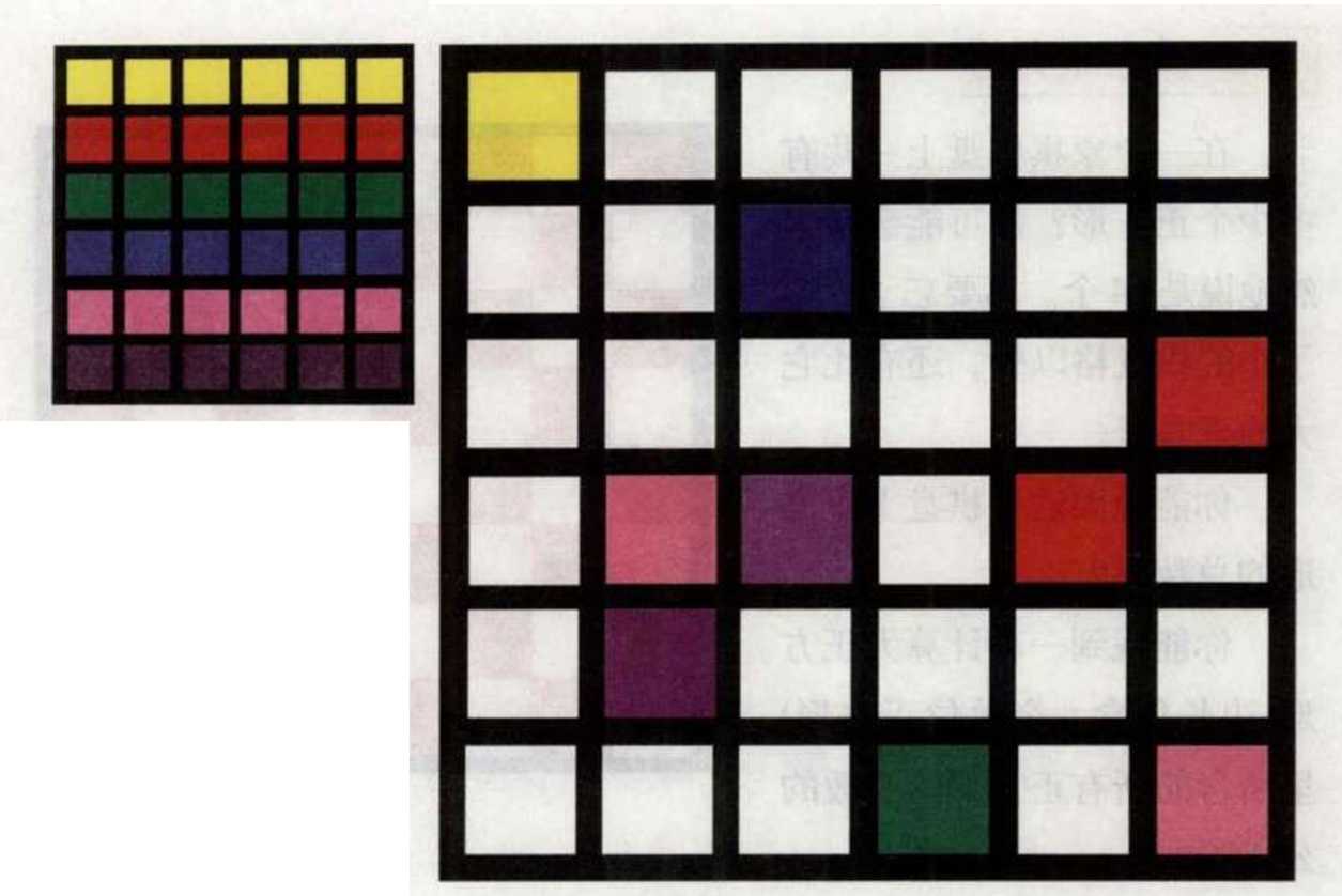 问题:按如下规则填满这个魔方网格:每种颜色在每一行、列中只出现一次,你能 办到吗?(可以有多种解法。)
