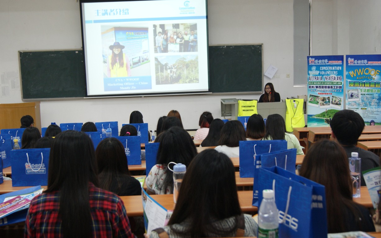 在宣讲会上,主讲人-澳洲义工组织中国区推广主任Mandy Jie为同学们详细介绍了CVA+WWOOF计划的澳洲体验1+1项目的内容以及分享了她和志愿者们在澳洲参加项目的经验和视频,同学们听得津津有味。宣讲会后,很多同学都留下来与工作人员相互交流,更深入地了解CVA+WWOOF澳洲体验项目。