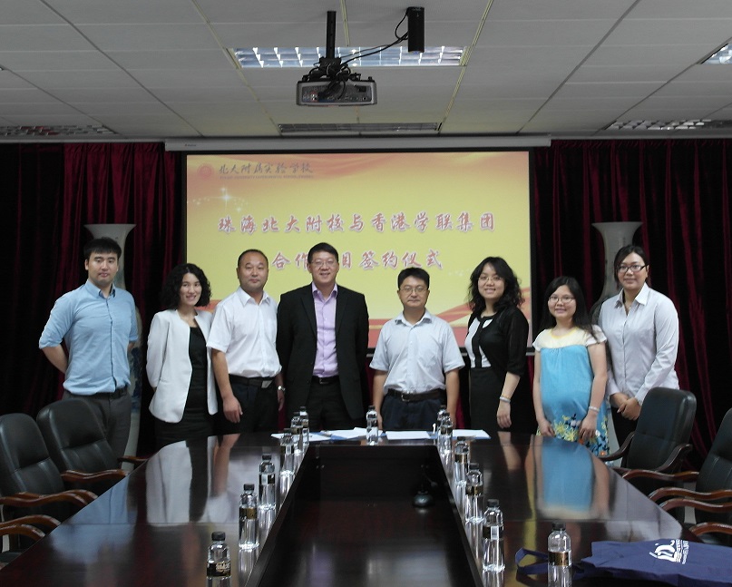 2014年5月19日,侨谊留学与珠海北大附属实验学校合作协议书签约仪式在学校会议室举行。香港学联海外升学中心行政总监黄联发,香港学联集团成员侨谊留学总经理郭文丽、副总经理谭慧娟,校长于涛博士,国际部主任于勇军、副主任黄庶儒等出席了该仪式。签约仪式由国际部主任于勇军主持,黄联发总监、郭文丽总经理和于涛校长分别作了重要讲话。