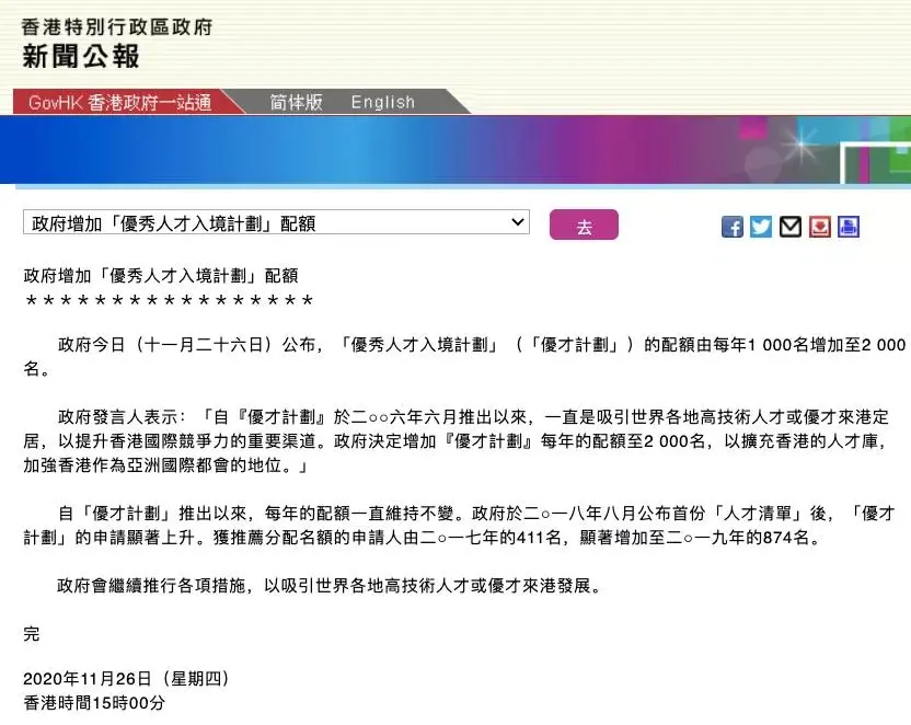 香港特区政府26日公布:将增加「优秀人才入境计划」的配额,由每年1000名增至2000名!
